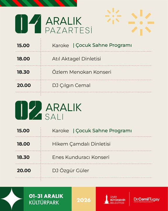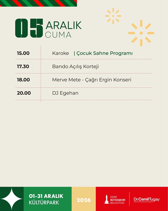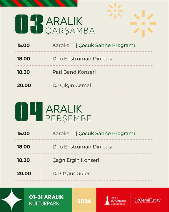 İzmir Yeni Yıl Festivali başlıyor! 1-31 Aralık tarihleri arasında Kültürpark'ta atölyeler, konserler, DJ performansları, hediyelik eşya pazarı ve buz pistiyle dolu bir festival atmosferi bizleri bekliyor. Bir ay boyunca yılbaşı ruhunu hep birlikte yaşayacağız. Yeni yıl coşkusunu hep birlikte karşılamak için hazırız. Festivalimiz pazartesi günü kapılarını açıyor. Herkesi Kültürpark'a bekliyoruz.