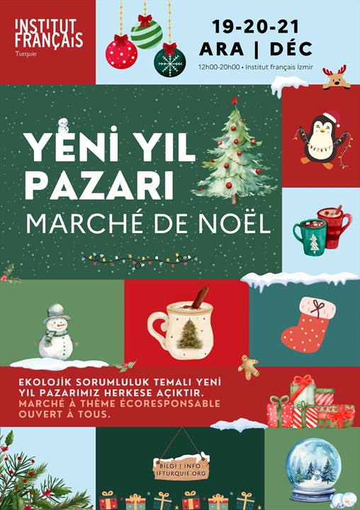 Institut français İzmir Yeni Yıl Pazarı, çevre dostu konseptiyle sonunda kapılarını yeniden açıyor ! 19-20-21 Aralık 2024 tarihlerinde saat 12.00 - 20.00 arasında Institut français İzmir bahçesinde gerçekleştirilecek olan Yeni Yıl Pazarına hepinizi bekleriz.